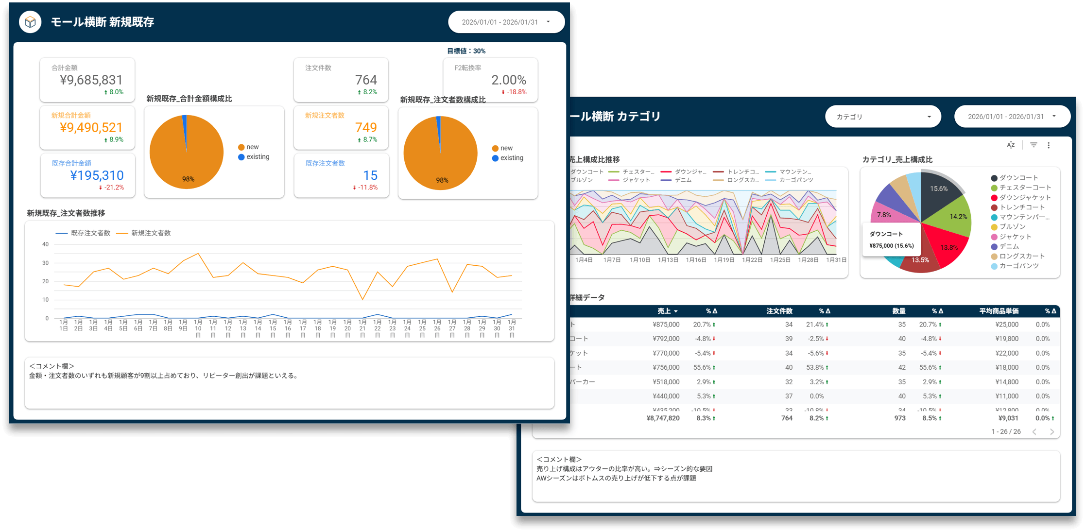 - ・日次チェックや状況把握、施策立案を1つのダッシュボードで完結できる